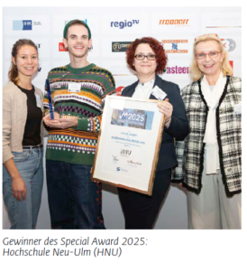 Noch jünger und bunter ging es weiter. Der Special Award für eine herausragende Einzelleistung ging an die Hochschule Neu-Ulm und deren Mitarbeiter Fabian Girschick, Digital Content Manager beim Verbundprojekt „InnoPROF“. Ziel ist es, Menschen für den Karriereweg der Professur zu begeistern.
